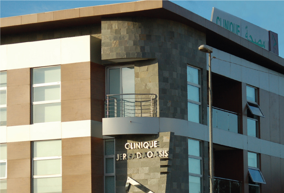 Clinique Oasis : Double Vitrage 8.8.10,Alubond Blanc et faux Bois; Cibma.